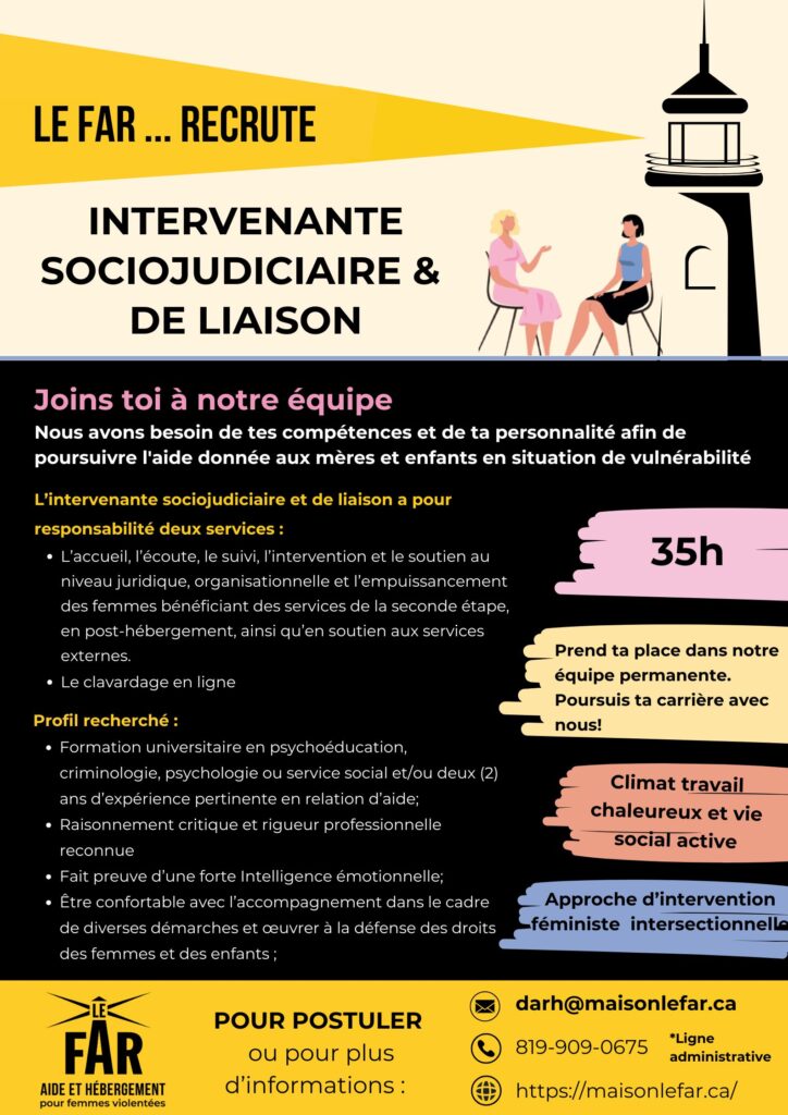 Tu carbures à l’intervention directe et à la création de liens dans un milieu communautaire ? La justice sociale est au coeur de tes priorités ? Tu as les compétences pour défendre les droits de nos femmes et de leurs enfants ? Tu es peut-être la personne idéale pour combler notre équipe en maison d’hébergement seconde-étape ! Un rôle essentiel pour soutenir, écouter et intervenir auprès des femmes et enfants en situation de vulnérabilité, tout en favorisant la reprise de pouvoir sur leur vie.