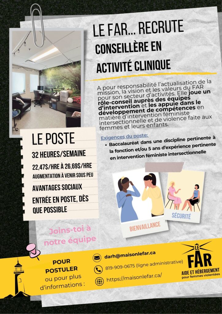 Tu carbures à l’intervention active et à la collaboration dans un milieu communautaire ? L’accompagnement des équipes et le développement des compétences en intervention font partie de tes forces ? L’approche féministe intersectionnelle est au cœur de tes valeurs profondes ? Tu es peut-être la personne que nous cherchons pour combler notre poste de Conseillère en activité clinique ! Un rôle clé pour soutenir nos intervenantes, actualiser nos pratiques et contribuer à notre mission auprès des femmes et enfants en situation de vulnérabilité.